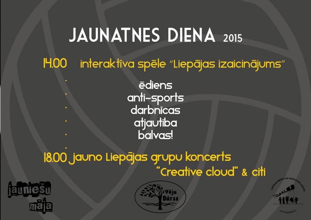 12. augustā Liepājas jauniešu mājas jaunieši Liepājas pludmalē rīko Jaunatnes dienas 2015 atzīmēšanas pasākumus, kurā var piedalīties visi Liepājas jaunieši.