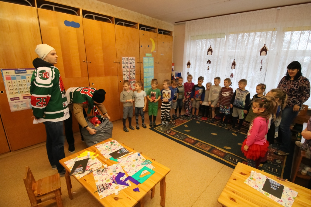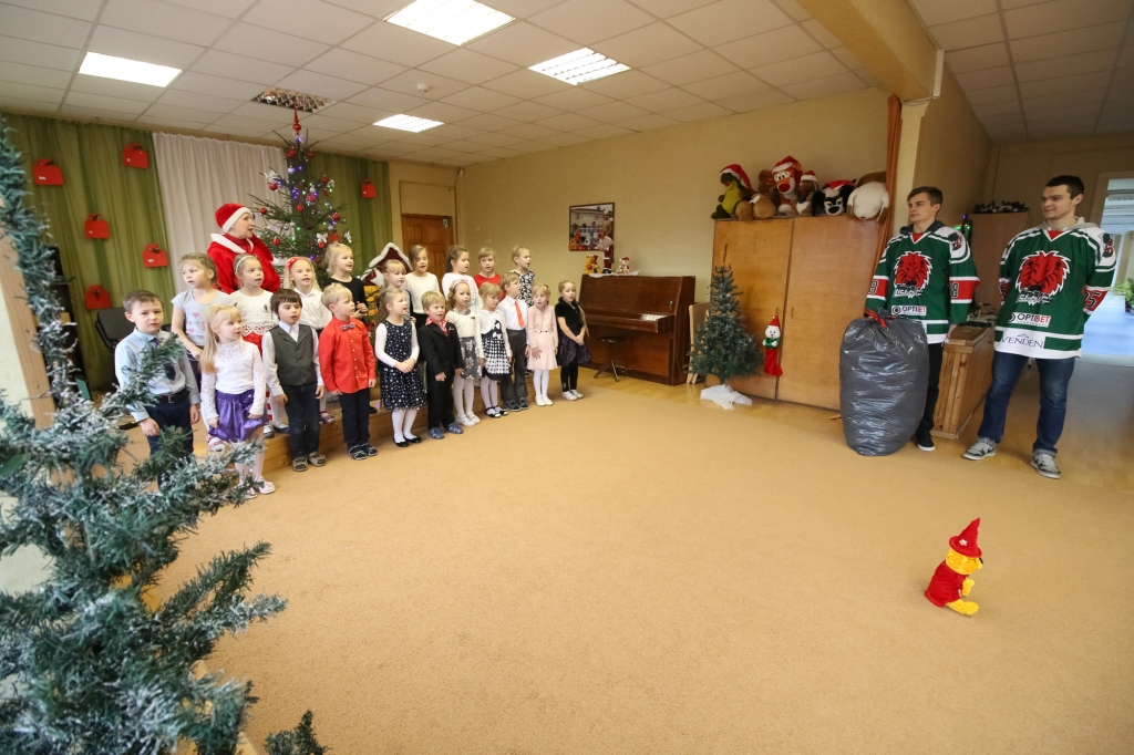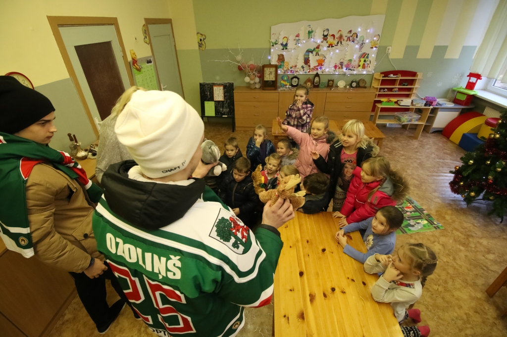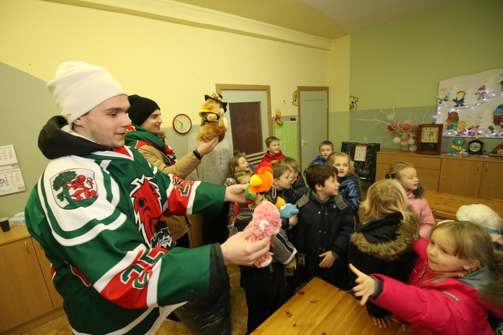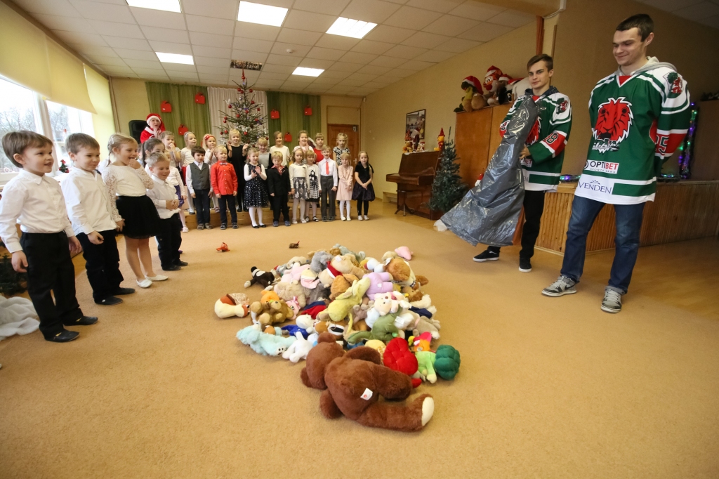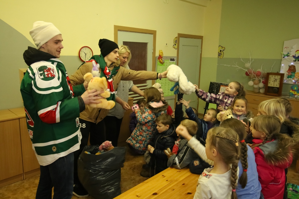 HK "Liepāja" hokejisti iejutās Ziemassvētku vecīšu lomā un dalīja ''Lāči lido'' spēlē uz ledus samestās mīkstās rotaļlietas Liepājas bērnudārzos.