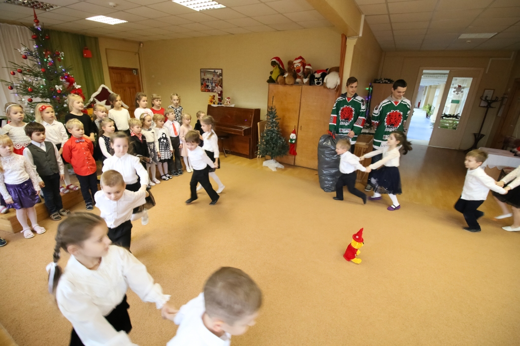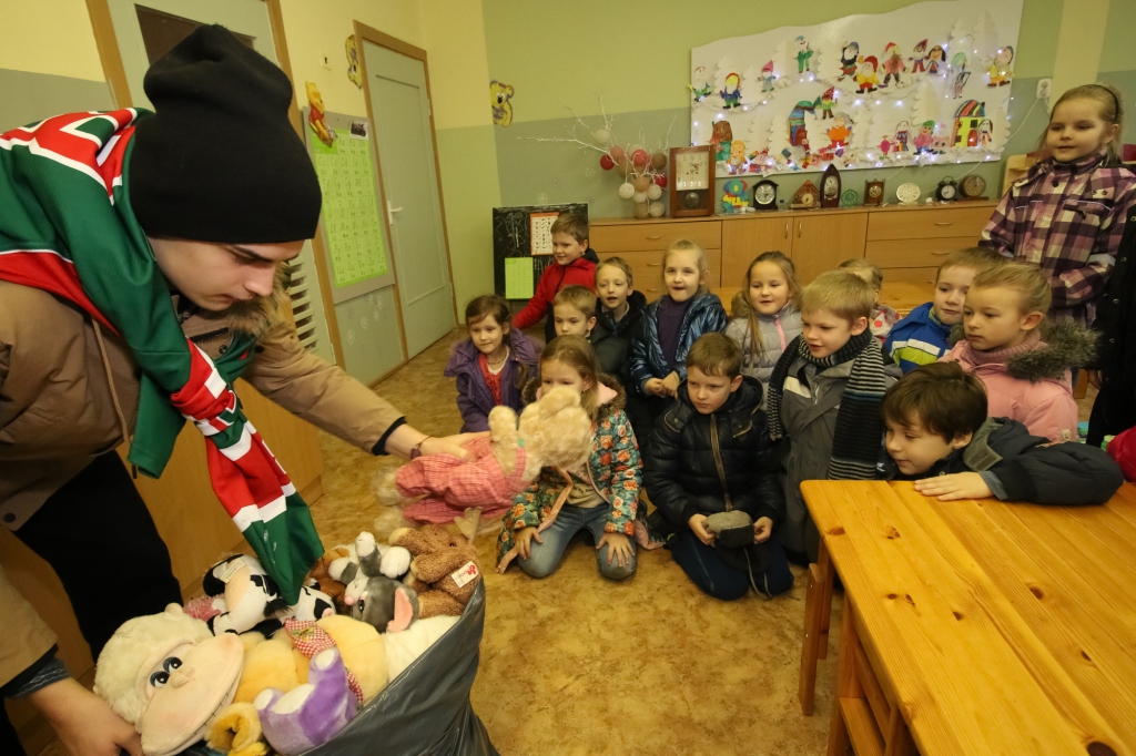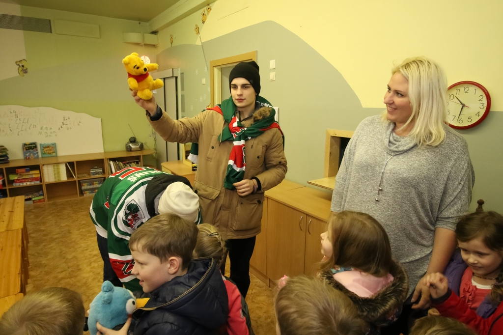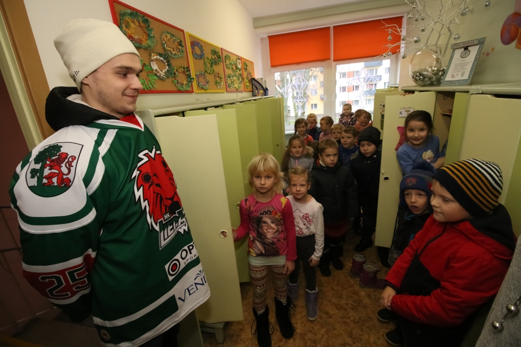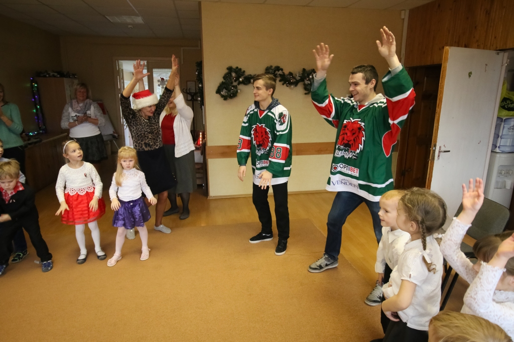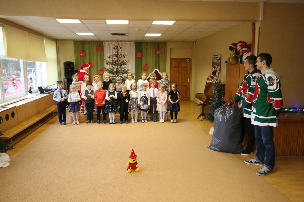 HK "Liepāja" hokejisti iejutās Ziemassvētku vecīšu lomā un dalīja ''Lāči lido'' spēlē uz ledus samestās mīkstās rotaļlietas Liepājas bērnudārzos.