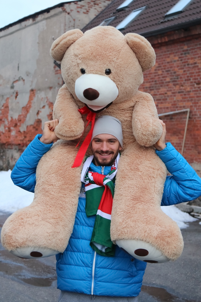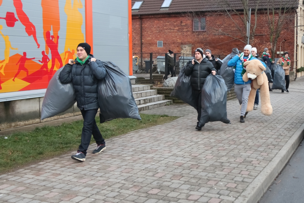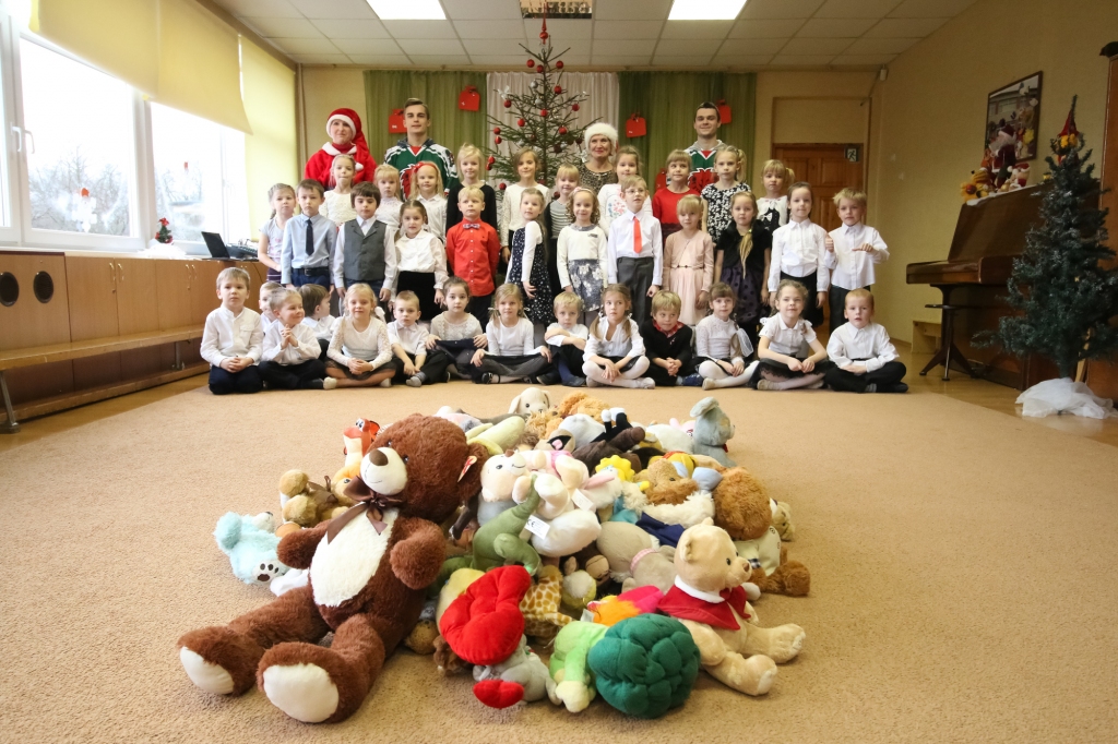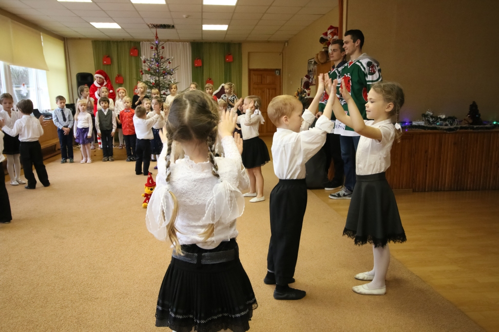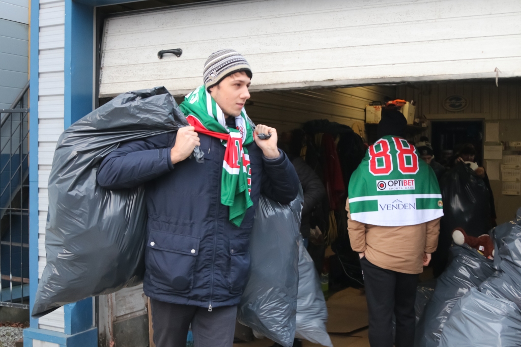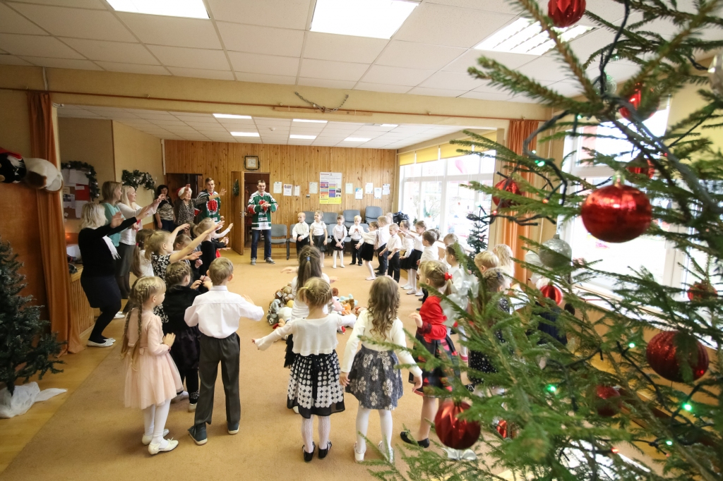 HK "Liepāja" hokejisti iejutās Ziemassvētku vecīšu lomā un dalīja ''Lāči lido'' spēlē uz ledus samestās mīkstās rotaļlietas Liepājas bērnudārzos.