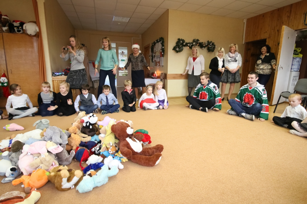 FOTO: Liepājas bērni saņem rotaļlietas no hokejistu rokām