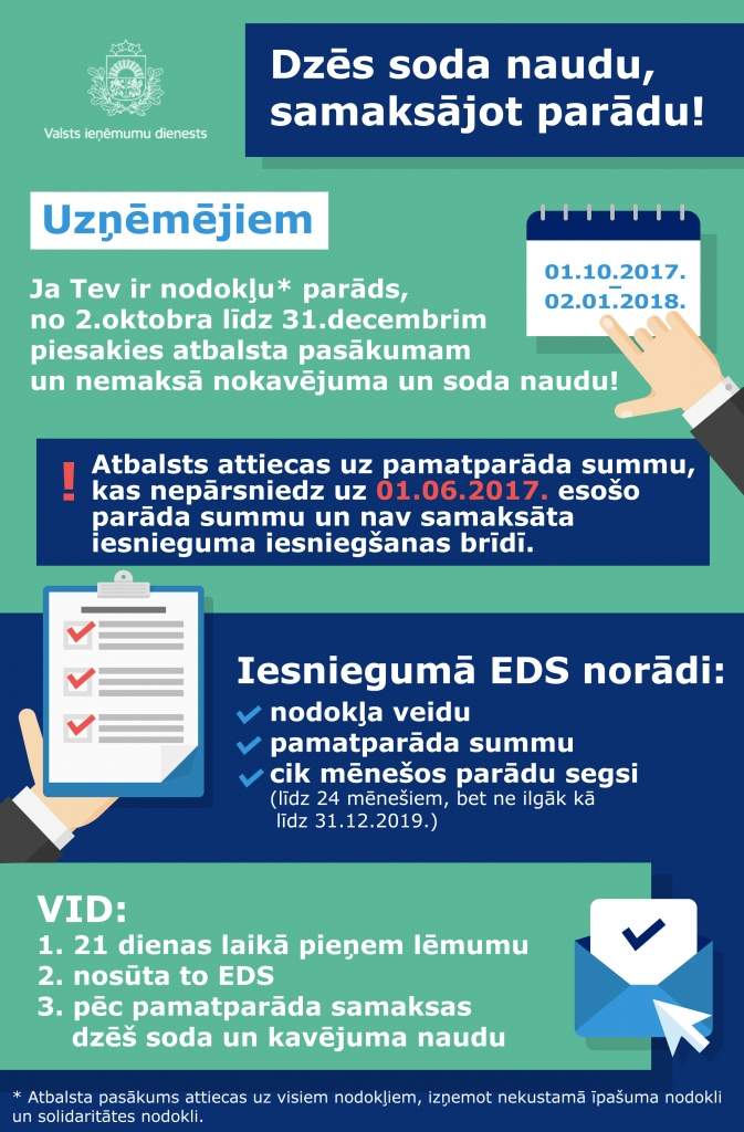 Ikviens, kam izveidojies nodokļu parāds, no 2017. gada 1. oktobra līdz 2018. gada 2. janvārim var Valsts ieņēmumu dienestā pieteikties nodokļu atbalsta pasākumam, informē dienests. Tā ievaros, samaksājot nodokļu pamatparādu, tiek dzēstas nokavējuma un soda naudas.