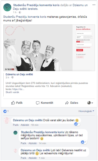 ''Esam ļoti gandarīti par pirmās dienas rezultātiem – aktivitāte ir liela, kas liecina par to, ka reģistrācija ir ātrs un viegls process, un dalībnieki tam savlaicīgi bija gatavojušies. Dalībai svētkos reģistrējas cilvēki no visas Latvijas. Arī vecuma ziņā vērojam plašu amplitūdu – šobrīd vecākais dalībnieks, kas ir piereģistrējies, ir 92 gadus vecs, bet jaunākais reģistrētais – 4 gadus jauns. Protams, mums ienāk arī dažādi jautājumi, atbildes uz kurām apkopojam un esam ievietojuši tās mājaslapā, kā arī aktīvi atbildam uz infotālruņiem. Redzam, ka arī Dziesmu un deju svētku kopiena sociālajos tīklos aktīvi iesaistās informācijas nodošanas procesā, dalās ar pieredzi, sniedz padomus. Tie ir lieliski kopdarba piemēri,'' akcentē Svētku izpilddirektore Eva Juhņēviča.