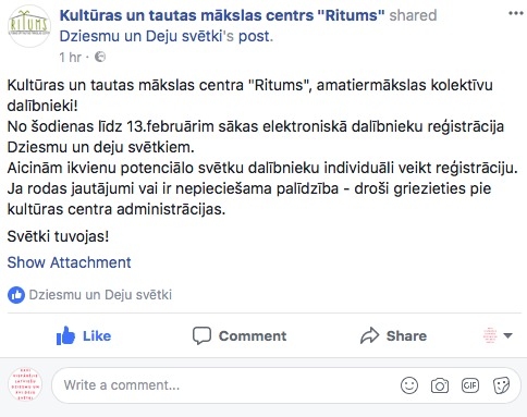 No 1. līdz 13. februārim visi potenciālie XXVI Vispārējo latviešu Dziesmu un XVI deju svētku dalībnieki aicināti elektroniski reģistrēties dalībai Svētkos. Līdz 1. februāra pulksten 17 jau bija piereģistrējušies 750 dalībnieku.