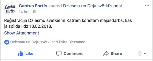 Dalībnieku elektroniska reģistrācija notiks www.dziesmusvetki.lv līdz 13. februārim (ieskaitot). Svētku rīkotāji aicina dalībniekus sagatavot nepieciešamo informāciju - fotogrāfiju augšuplādei (seja ir centrā, nav aizsegta, gaišs fons, skatiens vērsts kamerā, attēlā nav citu personu un/vai priekšmetu, 460x575 pix, 5 MB max, formāts ''jpg''), e-pastu vai mobilā tālruņa numuru, kurš tiek lietots ikdienā.