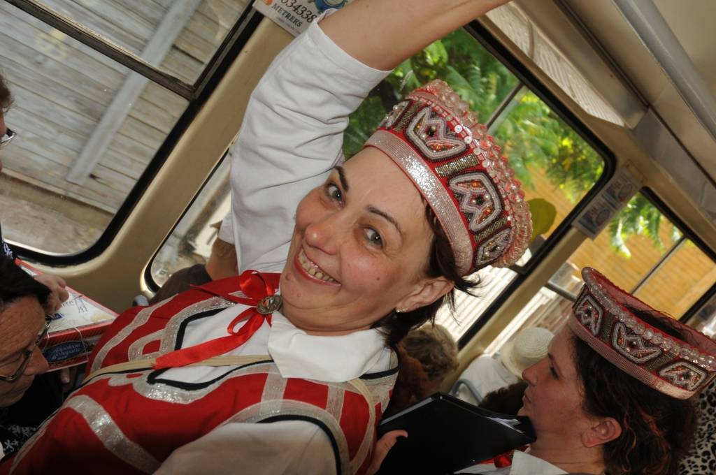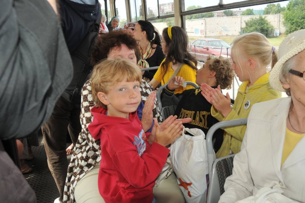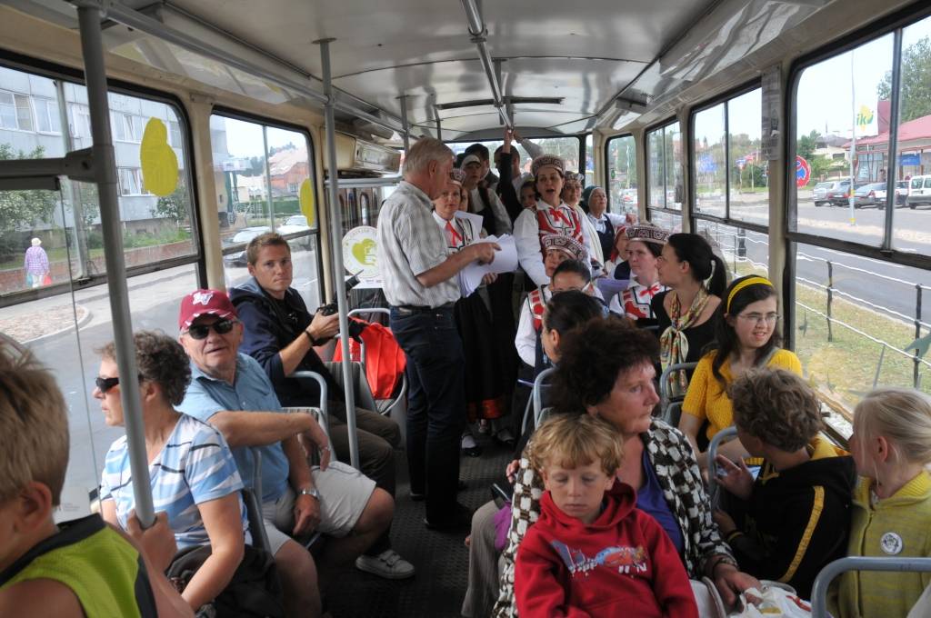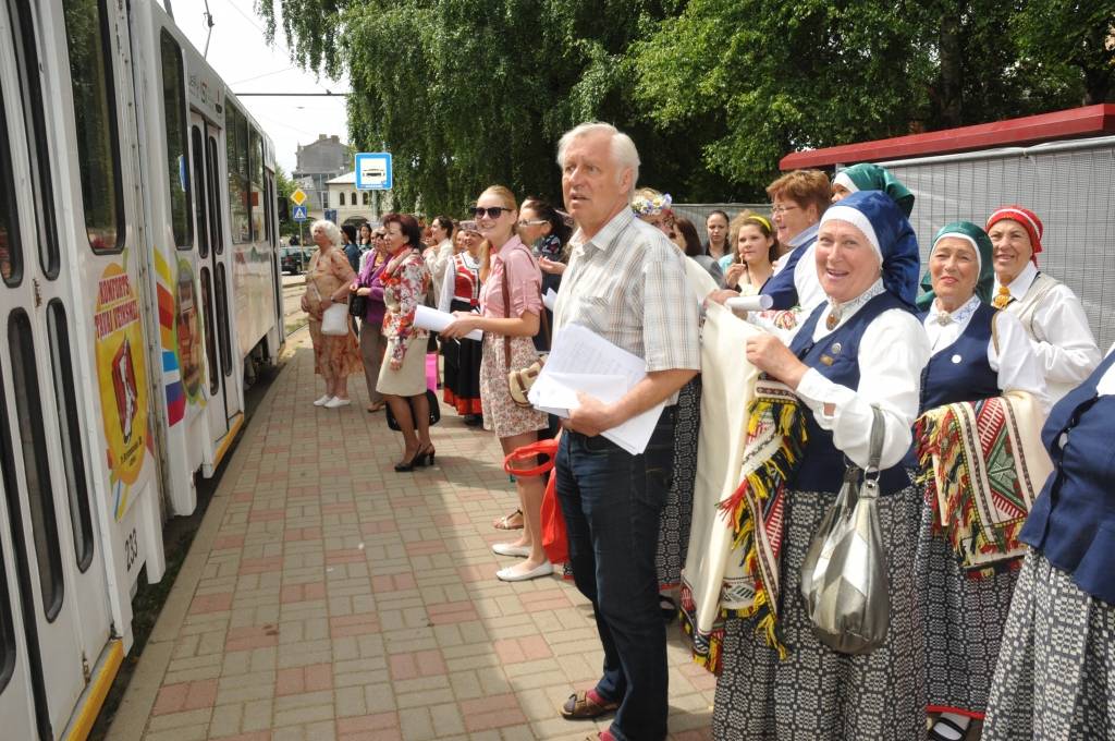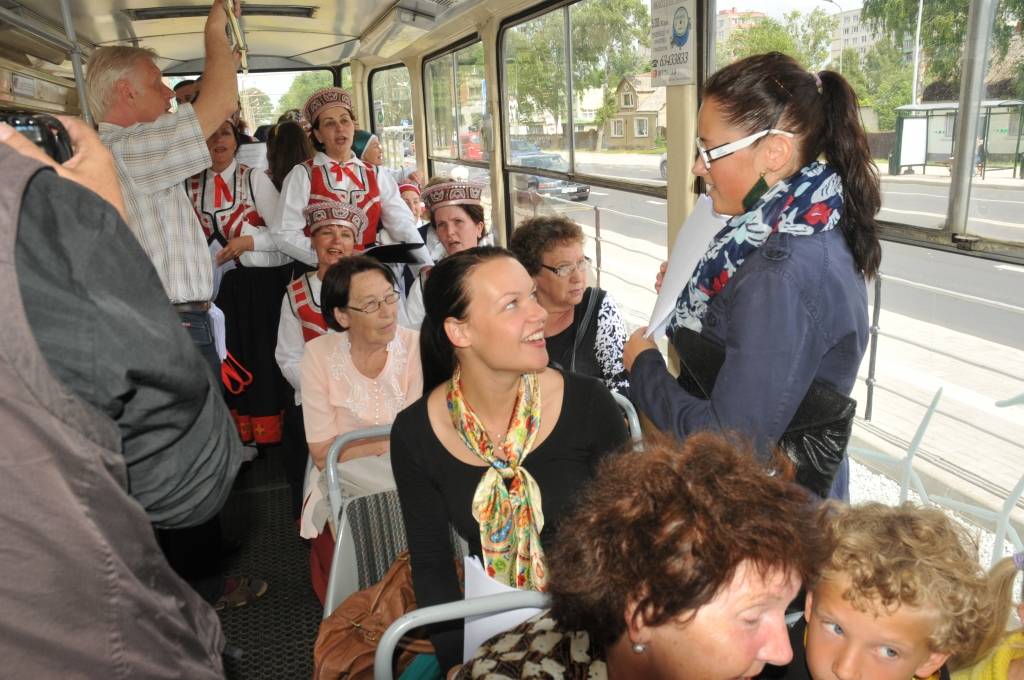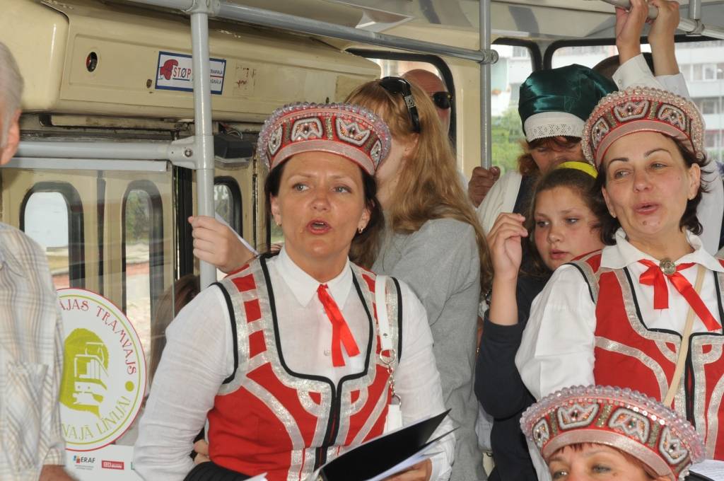 Tramvaja pasažierus priecēja kori "Līva", "Lauma" un "Kursa".