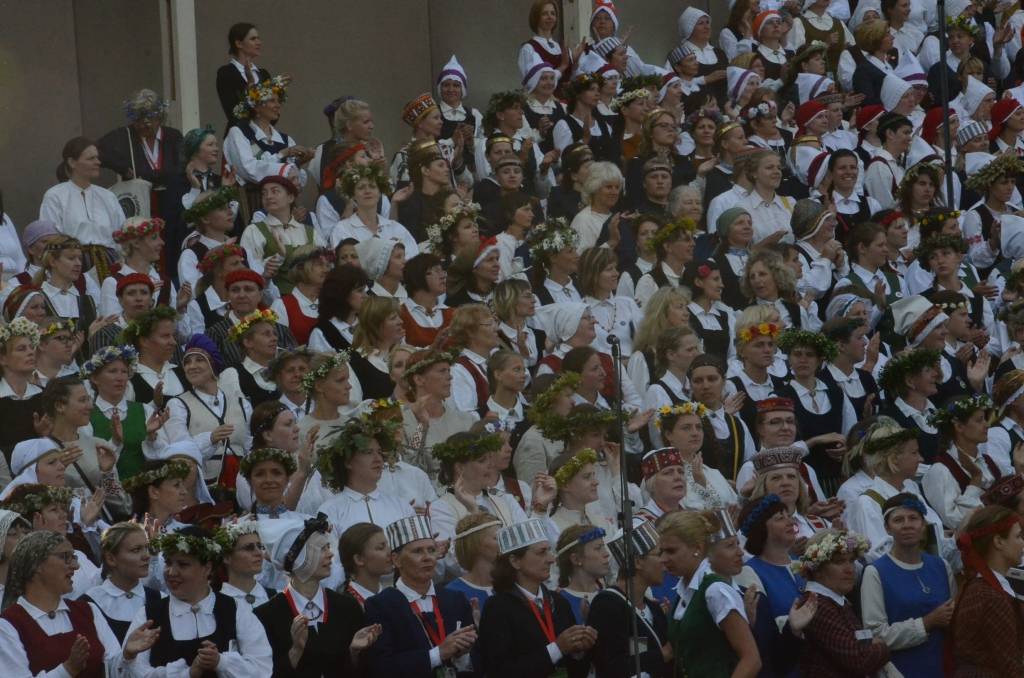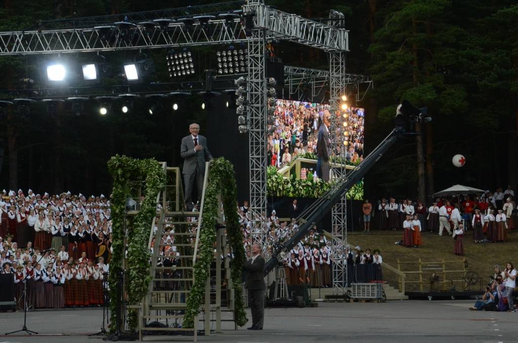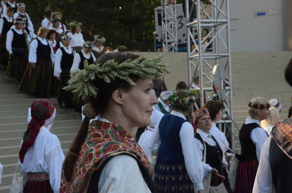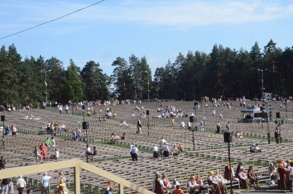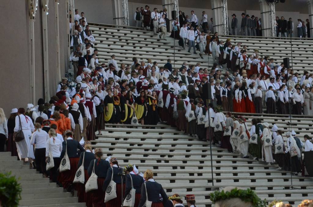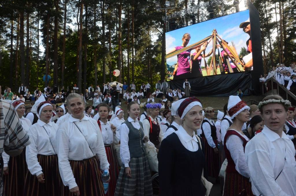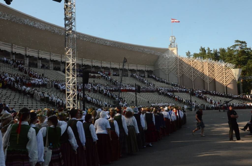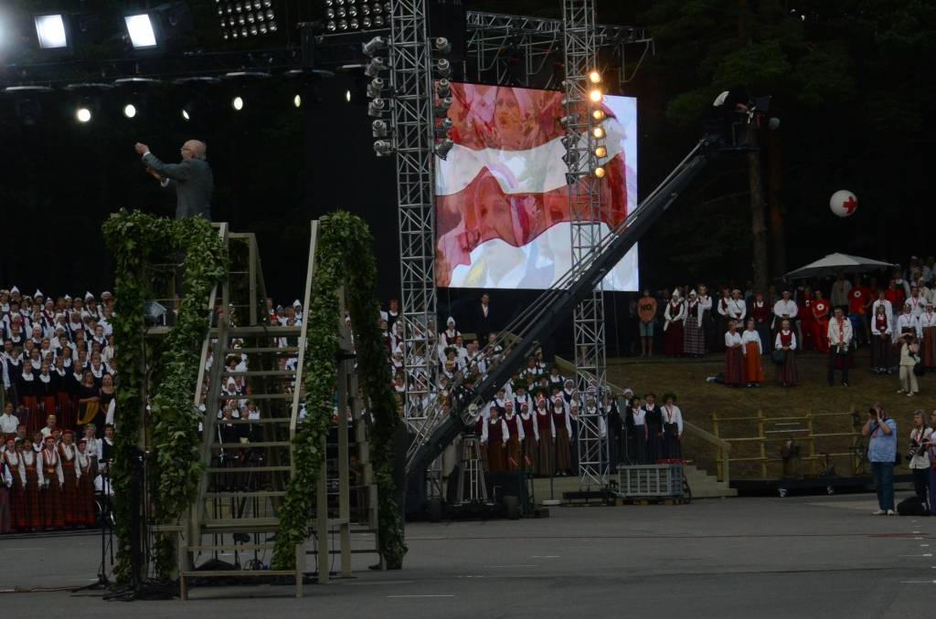 FOTO: Mežparka estrādē dziedātāji atpūšas un izdzied XXV Vispārējo latviešu Dziesmu svētku koncertu "Līgo"