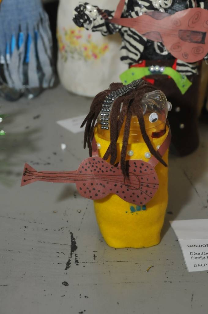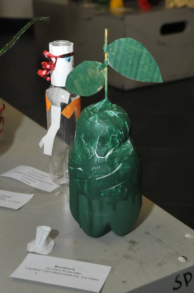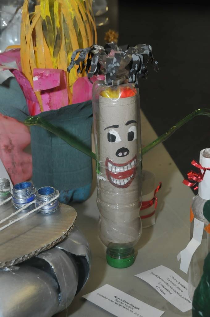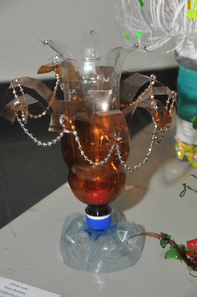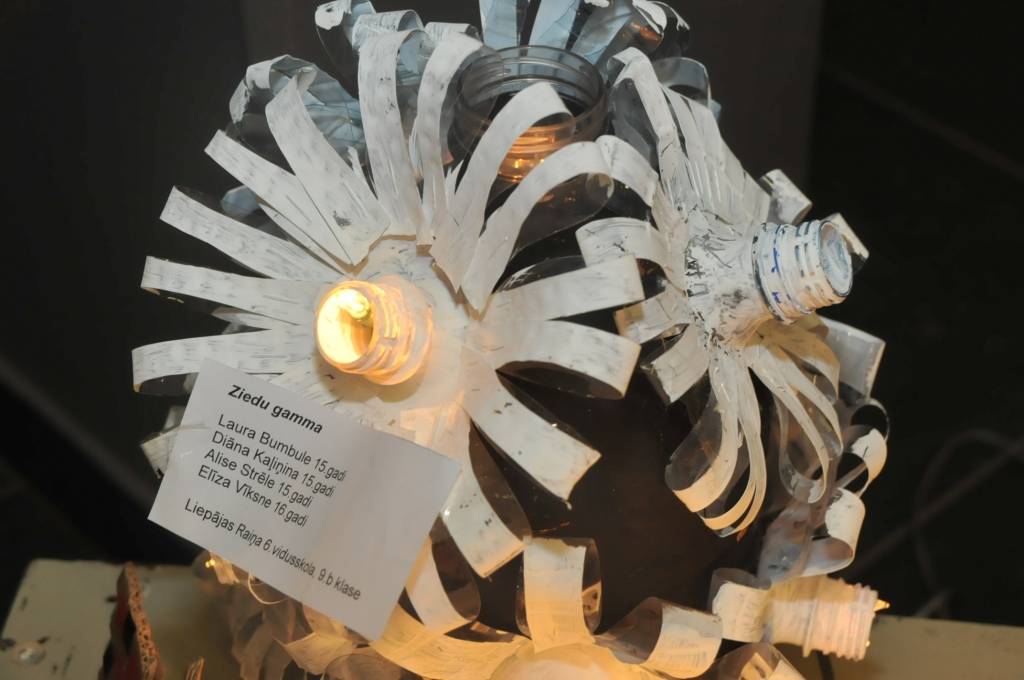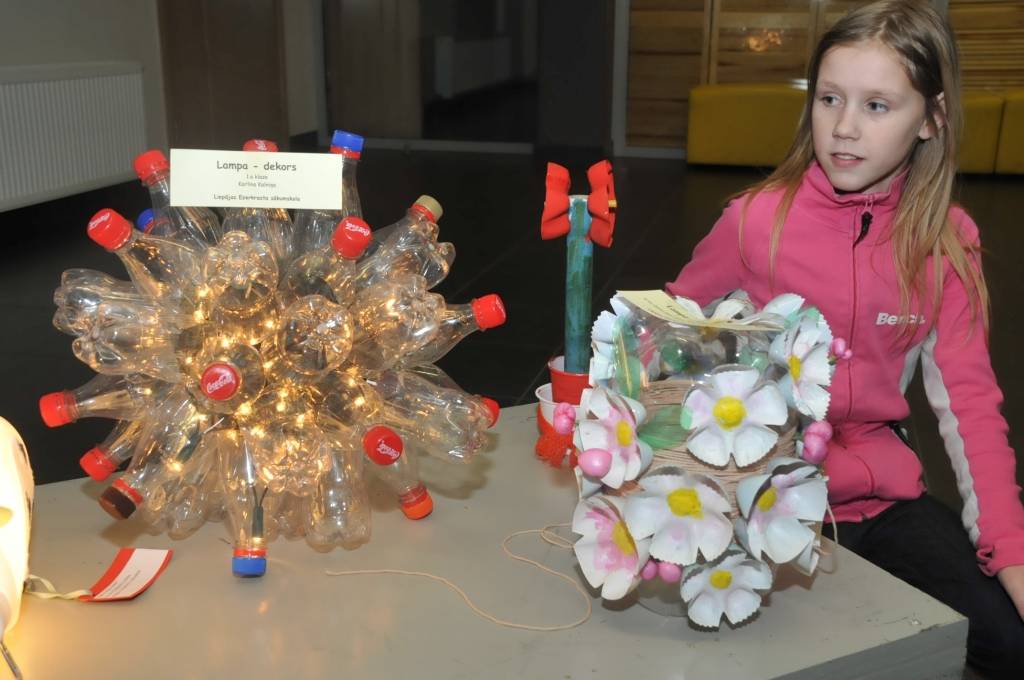 Izstādi veido Liepājas mācību iestāžu audzēkņu radītie darbi no PET pudelēm.