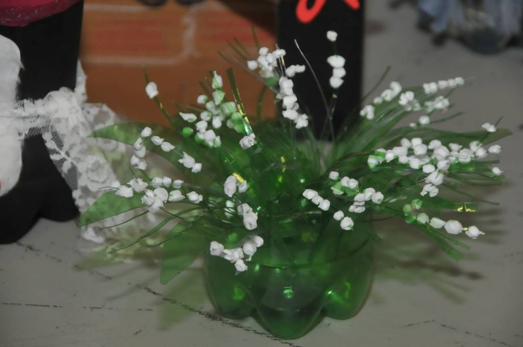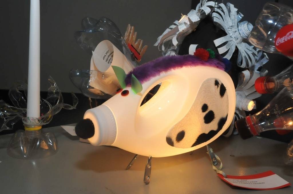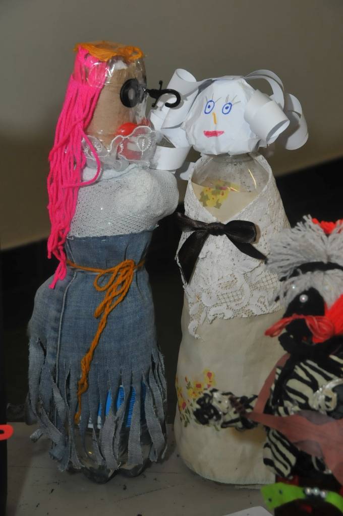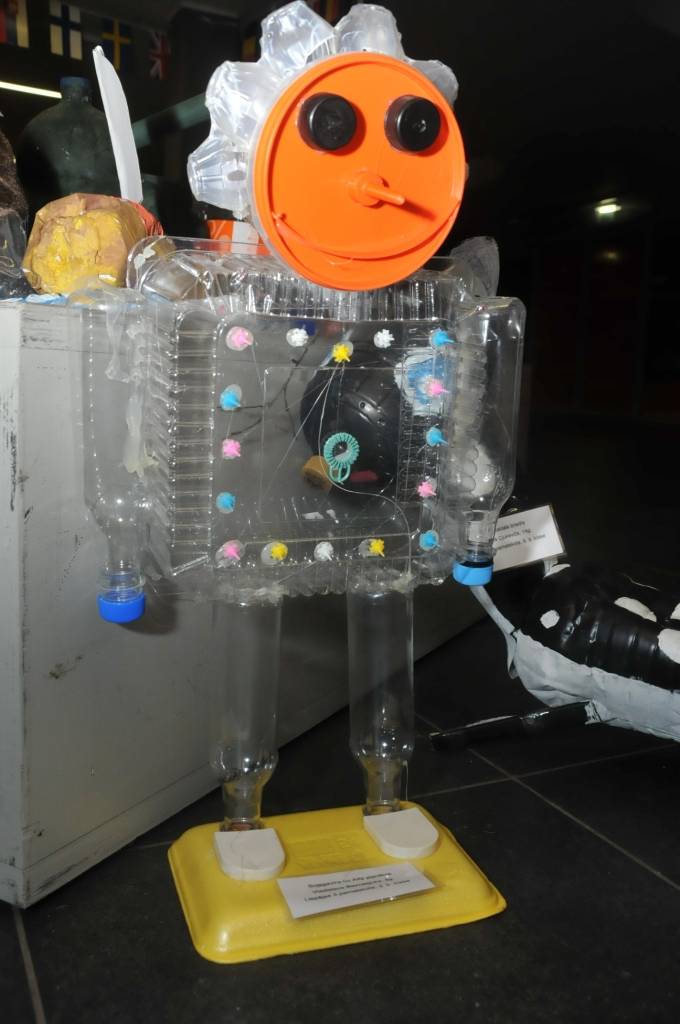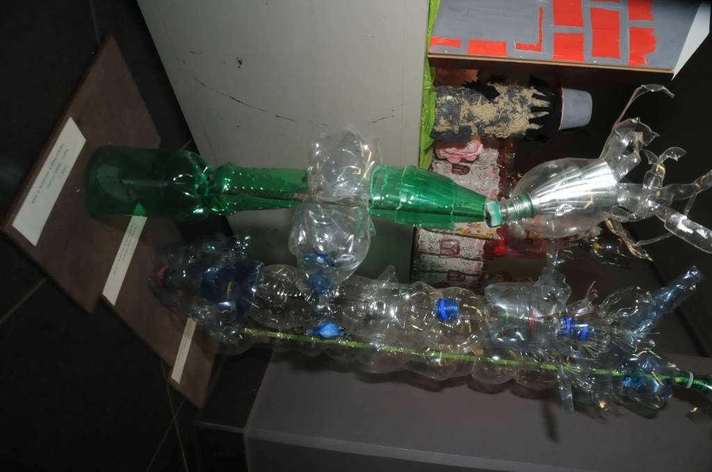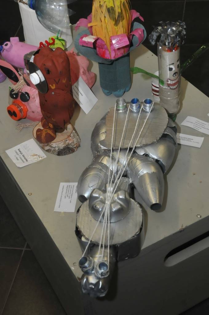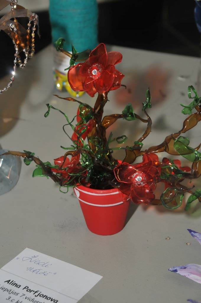 Izstādi veido Liepājas mācību iestāžu audzēkņu radītie darbi no PET pudelēm.